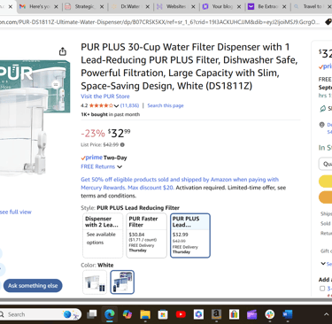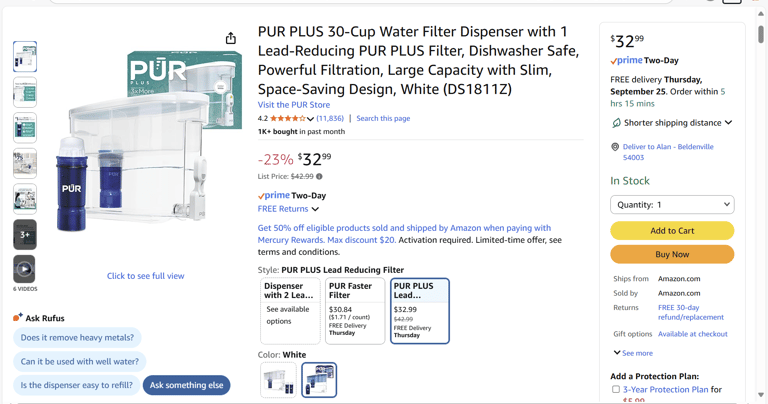 Amazon.com: PUR 30-Cup Countertop Water Filter Dispenser, 1 Genuine PUR Filter, 2-in-1 Powerful Filtration, Lasts 2 Months or 40 Gallons, Dishwasher Safe, White/Blue (DS1800Z): Home & Kitchen